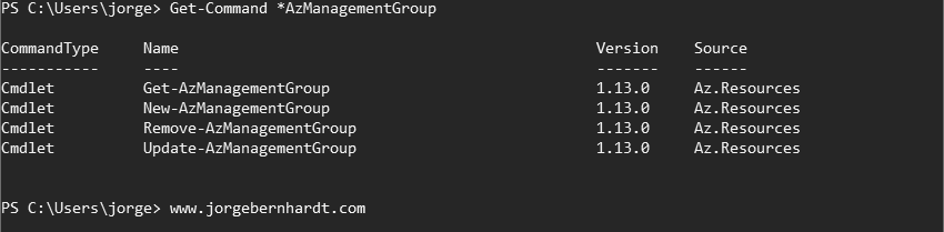 Once you set your default subscription, you’re ready to start. First, use the following command to list the cmdlets available to interact with the Management Groups.