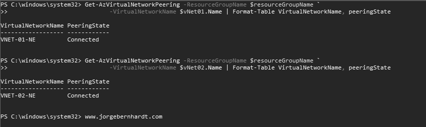 If you want to verify the peering status of the VNets, you should use the Get-AzVirtualNetworkPeering cmdlet as shown below: