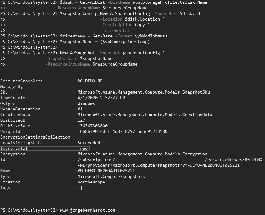 Microsoft has recently released the ability to take incremental snapshots of your managed disks. These types of snapshots include only all changes since the last snapshot. To use this type of snapshot follow the next steps. You must first get the disk you have snapshots of and want to take an incremental snapshot. To do this, you should use the cmdlet with the following syntax.