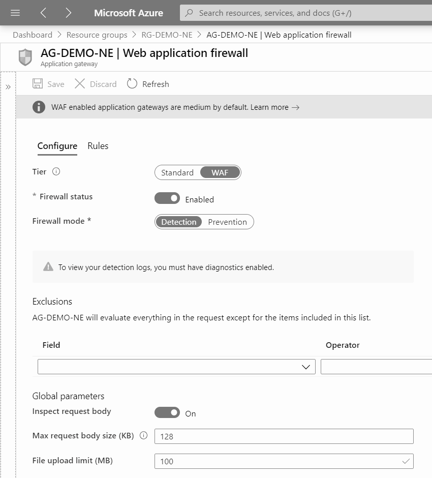 Once the Application Gateway has been created, you can enable the Web Application Firewall (WAF). To do this, you should use the Set-AzApplicationGatewayWebApplicationFirewallConfiguration cmdlet with the following syntax. This process will take approximately 20 minutes to complete.
