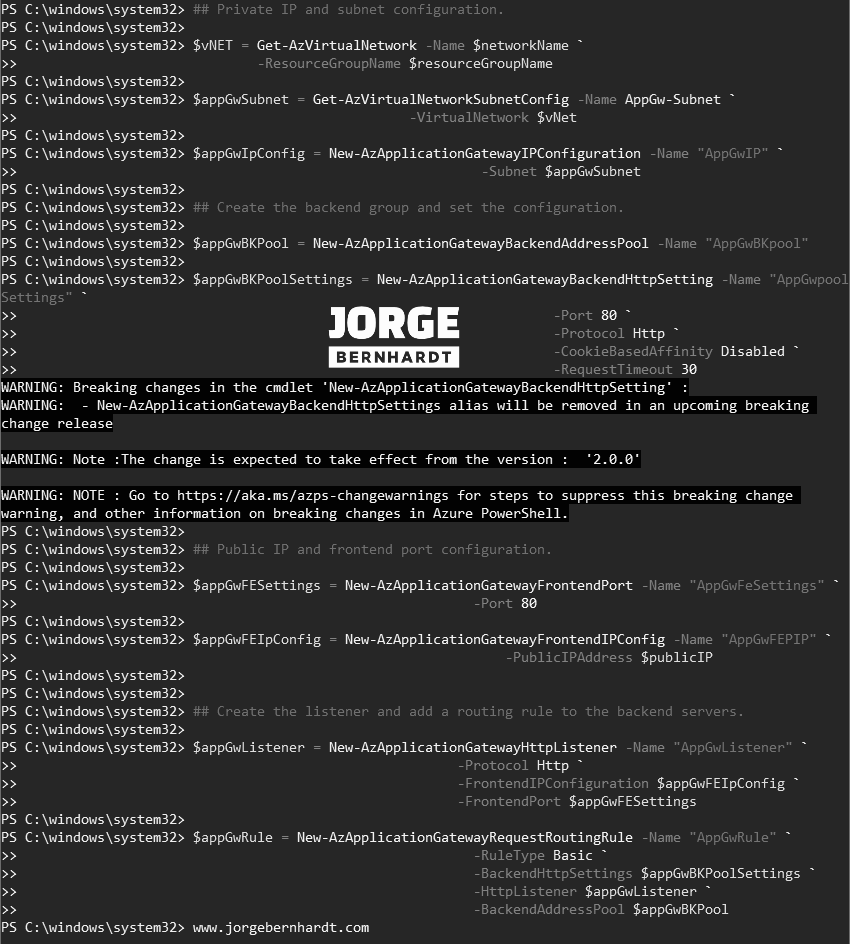 \## Private IP and subnet configuration.$vNET=Get-AzVirtualNetwork`-Name$networkName`-ResourceGroupName$resourceGroupName$appGwSubnet=Get-AzVirtualNetworkSubnetConfig`-NameAppGw-Subnet`-VirtualNetwork$vNet$appGwIpConfig=New-AzApplicationGatewayIPConfiguration`-Name"AppGwIP"`-Subnet$appGwSubnet## Create the backend group and set the configuration.$appGwBKPool=New-AzApplicationGatewayBackendAddressPool`-Name"AppGwBKpool"$appGwBKPoolSettings=New-AzApplicationGatewayBackendHttpSetting`-Name"AppGwpoolSettings"`-Port80`-ProtocolHttp`-CookieBasedAffinityDisabled`-RequestTimeout30## Public IP and frontend port configuration.$appGwFESettings=New-AzApplicationGatewayFrontendPort`-Name"AppGwFeSettings"`-Port80$appGwFEIpConfig=New-AzApplicationGatewayFrontendIPConfig`-Name"AppGwFEPIP"`-PublicIPAddress$publicIP## Create the listener and add a routing rule to the backend servers.$appGwListener=New-AzApplicationGatewayHttpListener`-Name"AppGwListener"`-ProtocolHttp`-FrontendIPConfiguration$appGwFEIpConfig`-FrontendPort$appGwFESettings$appGwRule=New-AzApplicationGatewayRequestRoutingRule`-Name"AppGwRule"`-RuleTypeBasic`-BackendHttpSettings$appGwBKPoolSettings`-HttpListener$appGwListener`-BackendAddressPool$appGwBKPool