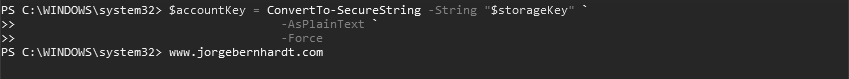 Using the ConvertTo-SecureString cmdlet we convert the account key into a secure string.
