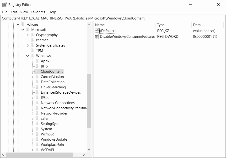 You can also disable Microsoft Consumer Experiences in the Windows Registry Editor, as follows: 1. Run Registry Editor (RegEdit). 2. Go to the following Registry key: HKEY_LOCAL_MACHINE\SOFTWARE\Policies\Microsoft\Windows\CloudContent 3. Locate the DisableWindowsConsumerFeatures on the right pane after selecting CloudContent. 5. Set the value of the Dword to 1. 6. Exit from Registry Editor. You may need to restart the computer for the change to take effect.